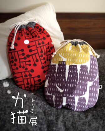 アトリエか猫・金子千晶さんのシルクスクリーンプリントの布で作られるバッグや小物たちが、お店いっぱいに並びます。